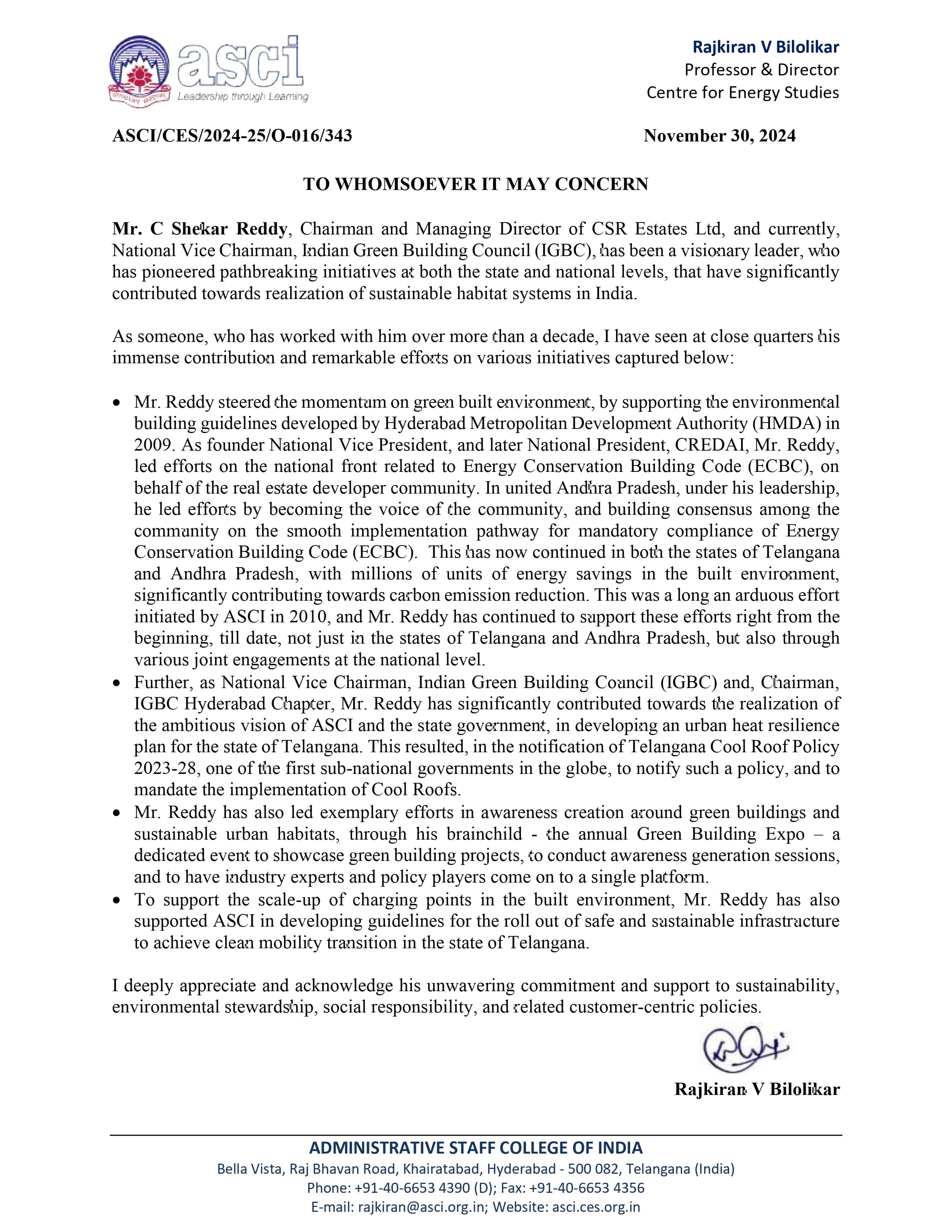 His most significant contribution to sustainability has been through his leadership within the Indian Green Building Council (IGBC) over the past two decades. As Chairman of IGBC Hyderabad Chapter and National Chairman of IGBC, Mr. Reddy has been instrumental in promoting green building practices across the country. Under his leadership, over 500 residential and commercial projects in Telangana adopted IGBC standards, covering a total built-up area of more than 300 million square feet. These initiatives have yielded substantial environmental benefits, including: